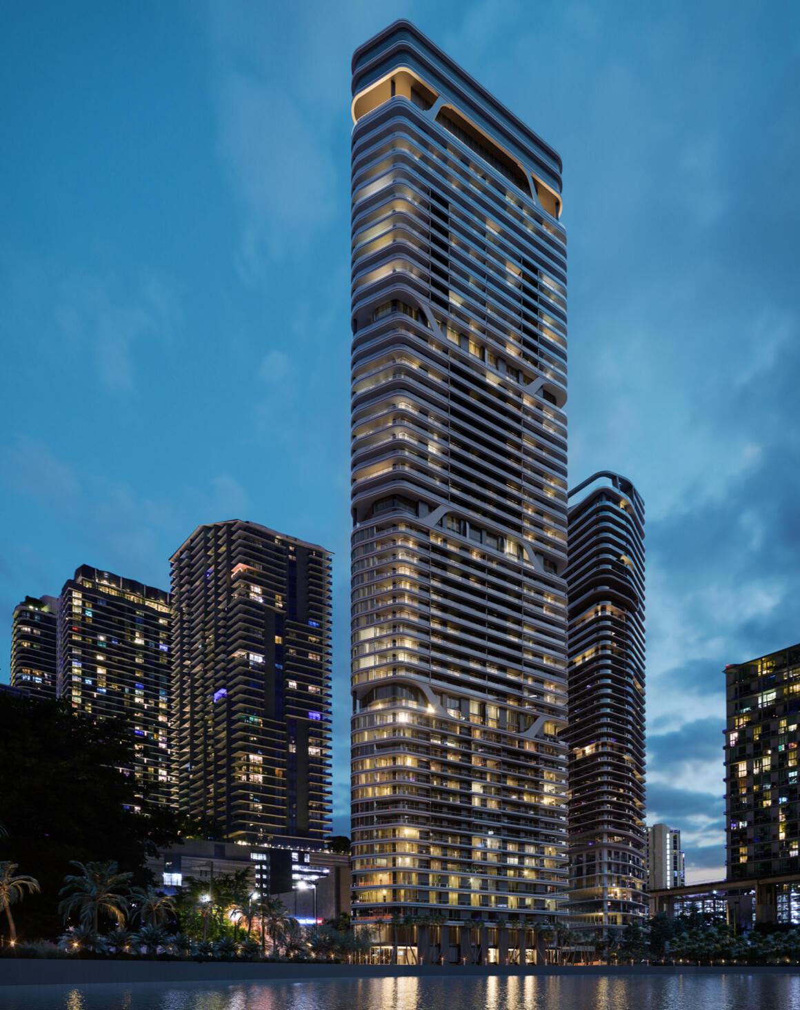 Brickell River Miami is a 59-story luxury tower rising 720 feet, by the Miami River. The building stands out for its curvilinear form, integrating fluid horizontal lines that wrap around each level. A recurring motif of sculpted horizontal bands appears in four distinct sections, breaking up the massing while reinforcing its vibrant architectural language. With high ceilings, abundant natural light, and modern finishes, all 160 residences feature the perfect living space that fits each family's unique preferences. With its fantastic location you are adjacent to the fantastic Brickell City Centre, placing world-class shopping, fine dining, and nightlife at your doorstep.